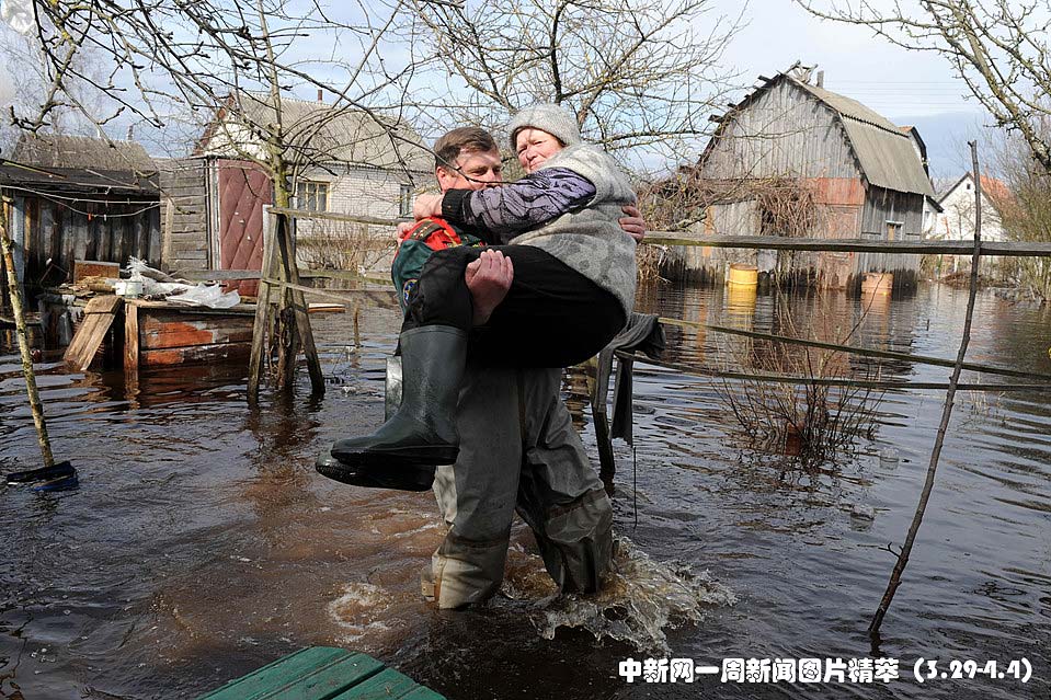 周二(30日),白俄罗斯冰雪融化导致河流泛滥。图为人们逃离家园。