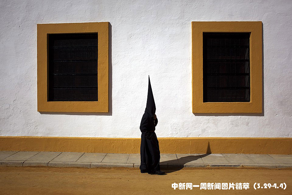 周三(31日),西班牙塞维利亚,一名“La Sed”教徒走在去教堂参加游行的路上。