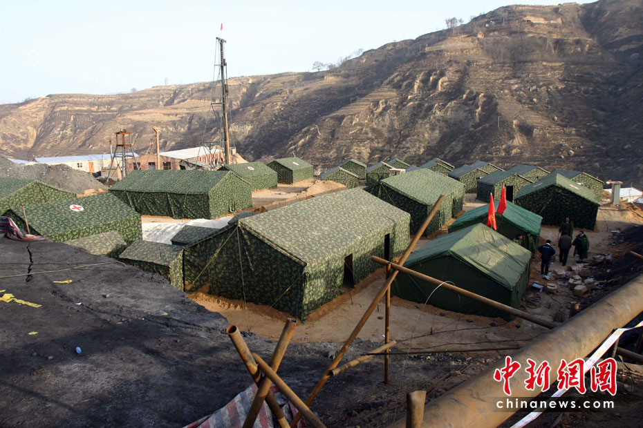 4月2日上午,记者在华晋焦煤有限公司王家岭矿透水事故抢险现场看到抢险帐篷已在离井口50米处搭起,届时抢险工人将在这里休整,为搜救井下矿工提供便利。中新社发 张云 摄