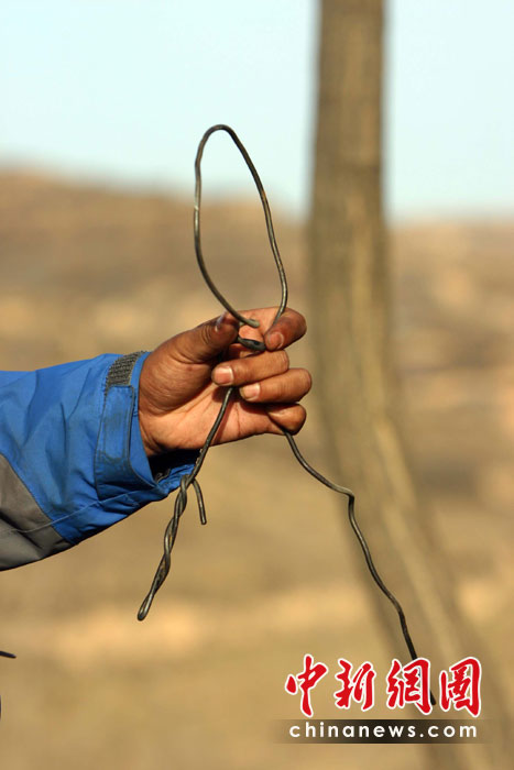 4月2日下午,华晋焦煤公司王家岭矿透水事故抢险人员为井下有生命迹象的2号垂直钻孔输送营养液,并静听井下人员反馈回音。图为2号垂直钻孔钻杆头抽出时,钻杆头上绑着带来生命迹象的铁丝。中新社发 张云 摄