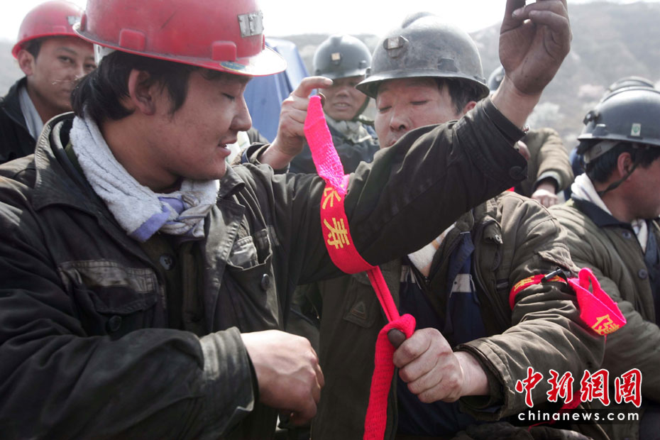4月4日,华晋焦煤公司王家岭矿透水事故第八天,抢险指挥部组成120人的救援大队下井,他们将在井下对获救矿工进行紧急救援。图为救援人员在胳膊上绑着象征长寿平安的红腰带。中新社发 张云 摄