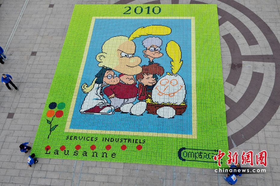 4月4日,瑞士洛桑的广场上,人们用6.6万枚彩蛋拼出一画巨大的卡通图像,用来为患癌症儿童筹集善款。图片来源:中国新闻网