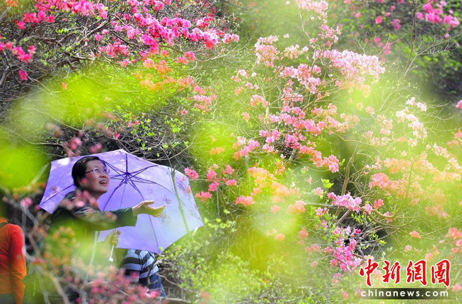 2010年4月4日,湖北武汉市黄坡区云雾山万亩杜鹃花竞相怒放,迎接八方游客踏青赏花。宋建春/CFP