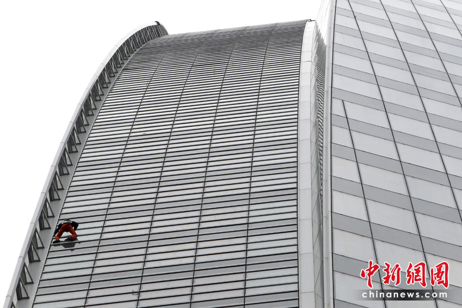 4月7日,巴黎,法国“蜘蛛人”罗伯特当日用了大约50分钟成功攀爬185米高的法国燃气苏伊士集团大楼。 图片来源:中国新闻网