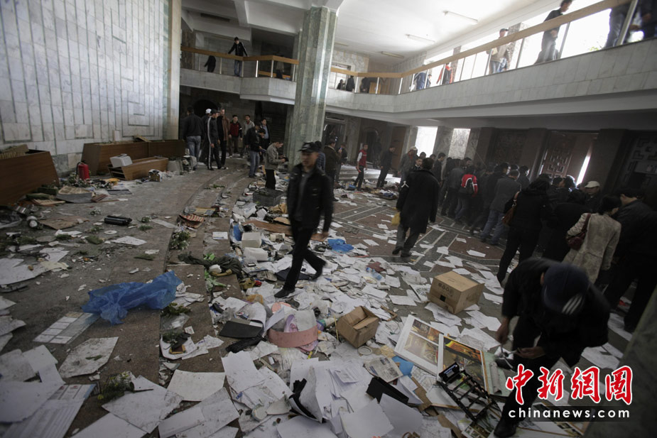 吉尔吉斯斯坦7日发生大规模骚乱,反对派示威者占领了议会大楼,8日,总统府也被示威者占领。图为政府总部一片狼藉。