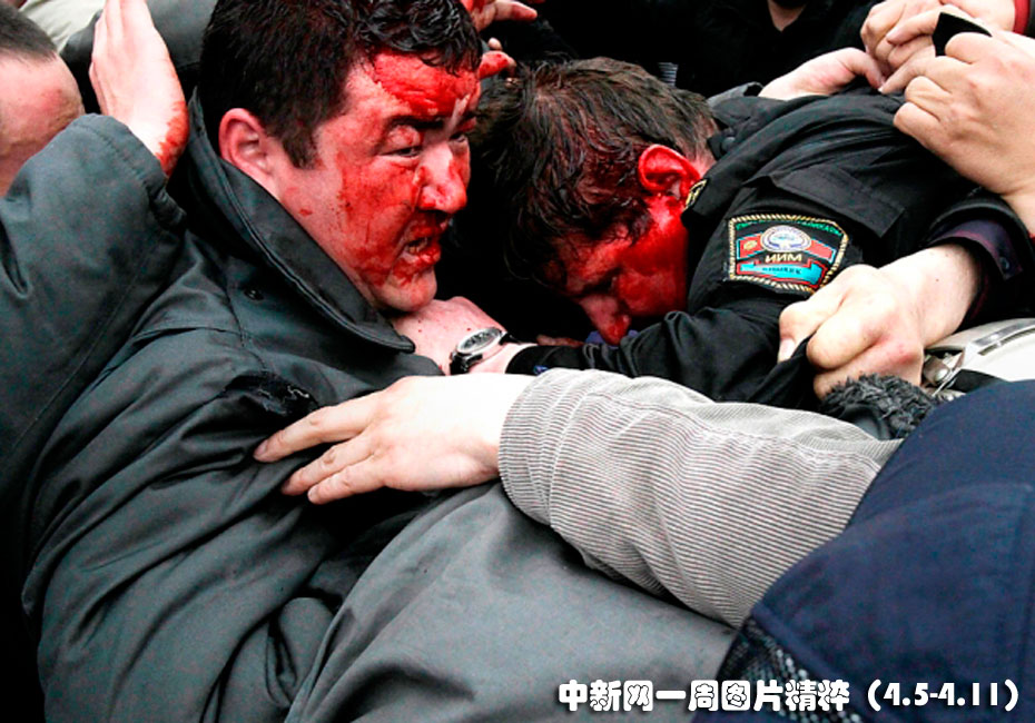 4月7日周三,吉尔吉斯斯坦的比什凯克发生抗议事件,受到攻击的吉尔吉斯警察挤在一起互相保护。