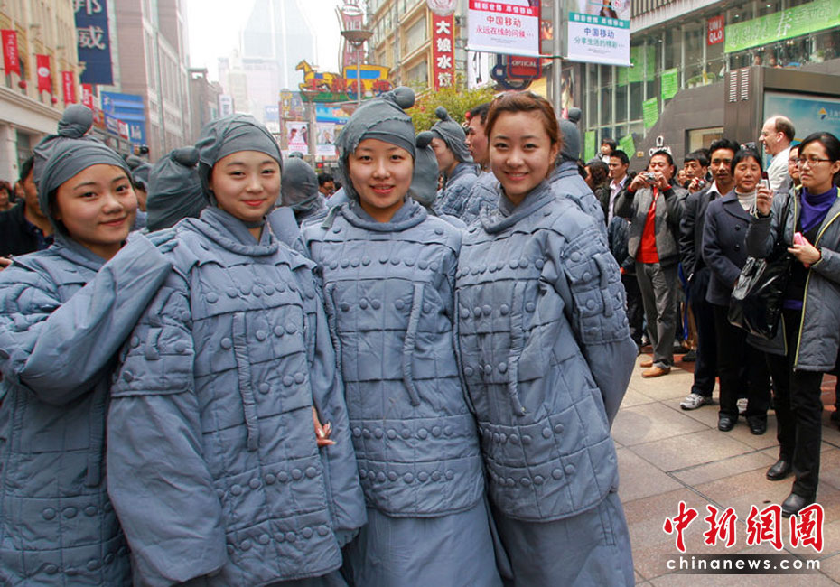 4月10日,由西安旅游局承办的兵马俑牵手上海世博会大型旅游宣传咨询活动举行。来自兵马俑故乡的百人表演队伍,身着灰色的兵马俑服装,以铿锵的节奏、雄壮的气势,在上海南京东路步行街和东方明珠广场游演,吸引了大批市民及海内外游客驻足观看。朱良城/CFP
