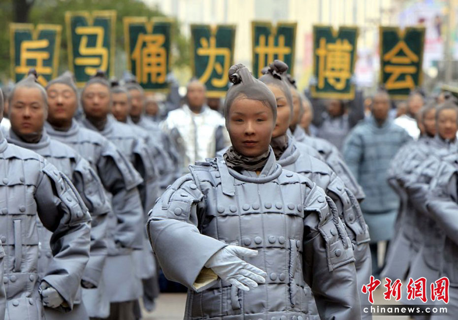 4月10日,由西安旅游局承办的兵马俑牵手上海世博会大型旅游宣传咨询活动举行。来自兵马俑故乡的百人表演队伍,身着灰色的兵马俑服装,以铿锵的节奏、雄壮的气势,在上海南京东路步行街和东方明珠广场游演,吸引了大批市民及海内外游客驻足观看。文音/CFP