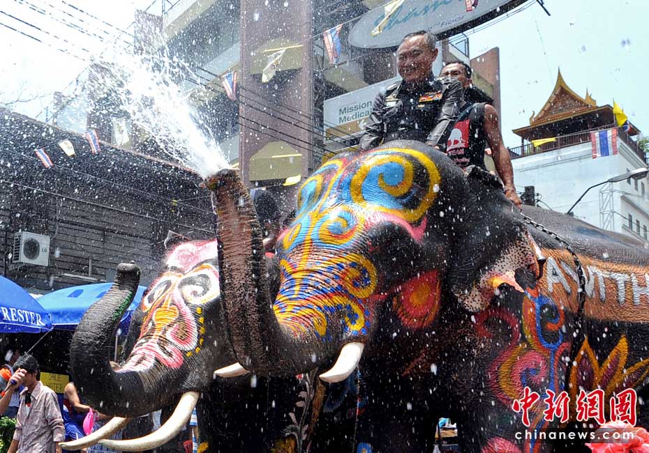4月12日,泰国迎来一年一度的泼水节,在拷桑路旅游区人们用水枪与大象“互喷”希望为对方送上祝福同时庆祝泰国新年。图片来源:中国新闻网