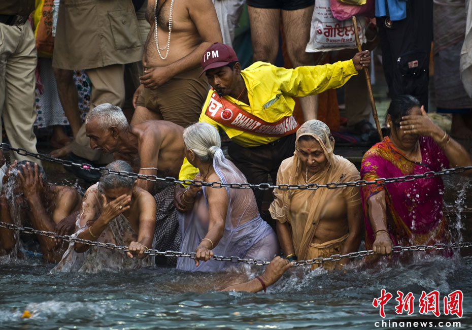 4月13日,印度教传统节日“大壶节”步入尾声,前来参加盛典的上万苦行僧赤裸身体涌入恒河,祈求洗清身上的“罪恶”。图片来源:中国新闻网