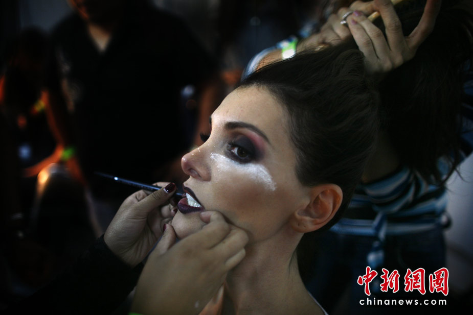 4月13日,墨西哥首都墨西哥城奔驰时装周,美模们在台前展现靓丽风采,后台则让我们看到了完全不同的世界。