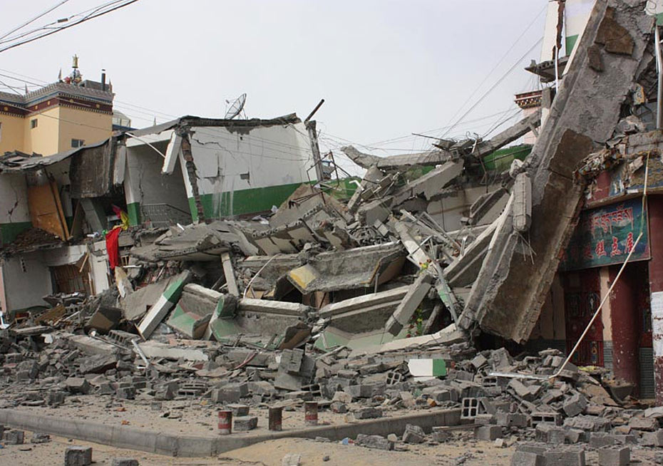 图为4月14日拍摄的玉树州结古镇倒塌的房屋。图片来源:新华网 吴宏 摄