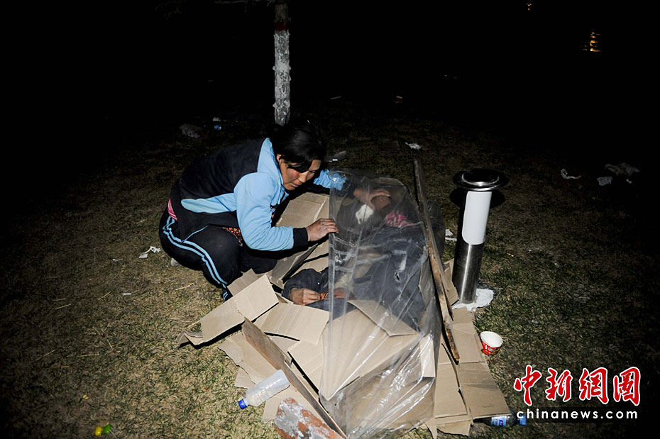 图为4月15日凌晨,青海玉树地震受灾民众在露天睡觉,由于救灾物资匮乏有的民众只得以塑料薄膜当棉被御寒。中新社发 廖攀 摄