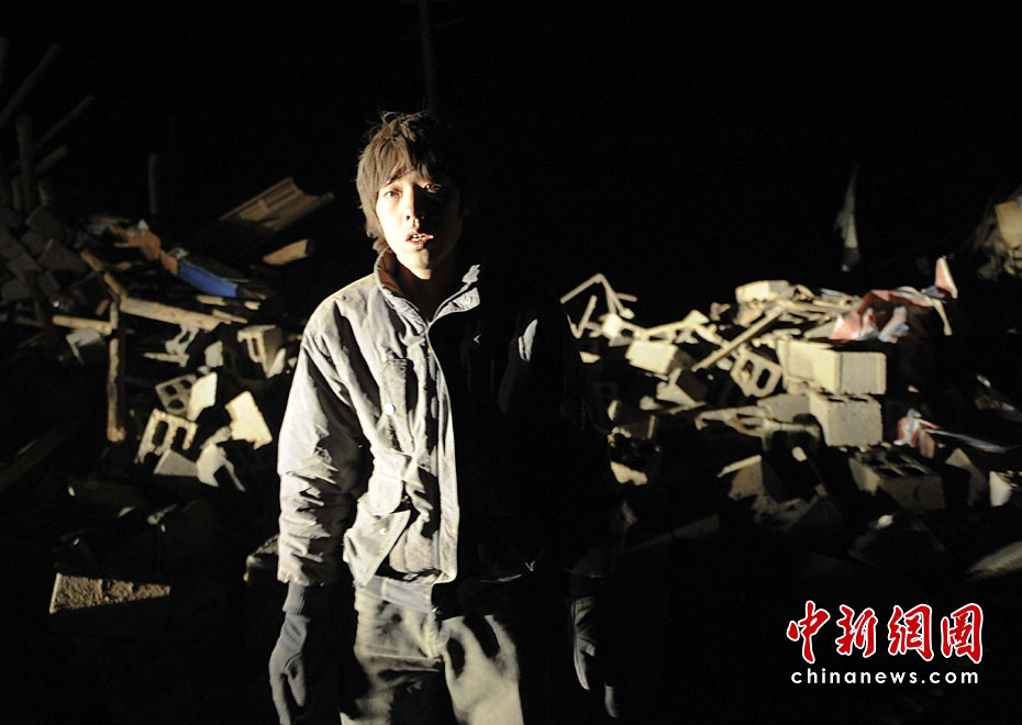 图为4月15日凌晨1时,青海玉树地震灾区居民摸黑在地震废墟中寻找亲友。中新社发 廖攀 摄