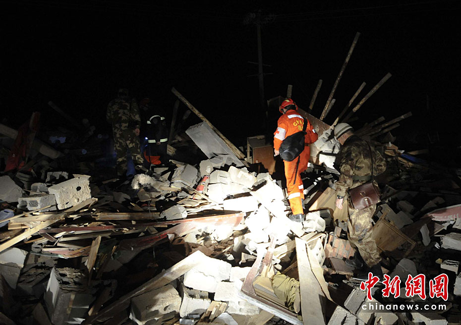 图为4月15日凌晨1时,武警玉树州支队战士和中国国际救援队队员一起搜救被困民众。中新社发 廖攀 摄