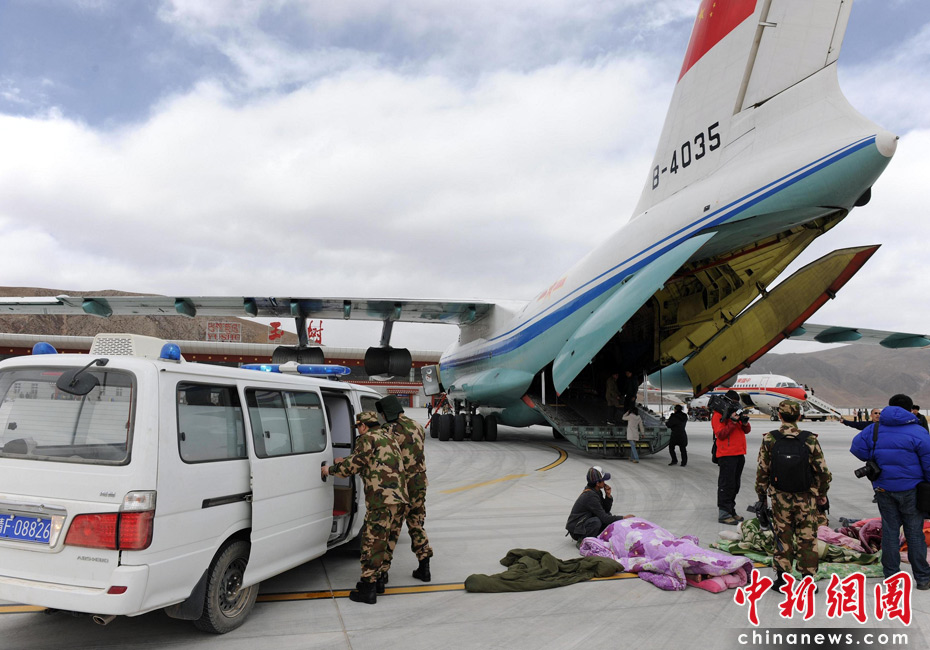 15日下午3时许,空军动用一架伊尔-76运输机在玉树机场起运30多位震灾伤员,就近飞往成都市进行救治。中新社发 符永康 摄