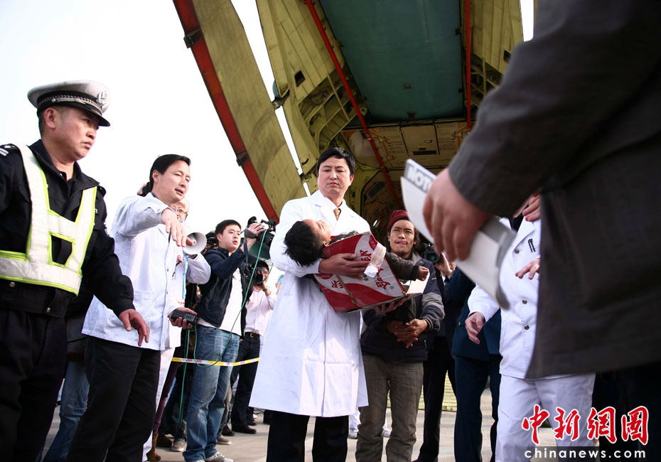 一架载有青海玉树地震首批伤员及伤员家属的中国空军运输机抵达成都双流国际机场,其中35名地震伤员将被分别送往四川省人民医院和四川大学华西医院进行治疗,运输机于15日下午15时30分从玉树当地机场起飞,经过1小时30分的飞行,历程800公里,于4月15日下午17时03分,顺利抵达成都。图为医院抢救人员正将受伤小孩从飞机抱往救护车。中新社发 张浪 摄