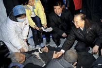 4月15日20时,中国国务院总理温家宝来到青海省玉树县玉树自治州医院看望受灾民众。这是温家宝握着一位藏族大妈的手问候其身体情况。国务院副总理回良玉、国务委员孟建柱参加看望慰问。中新社发 廖攀 摄