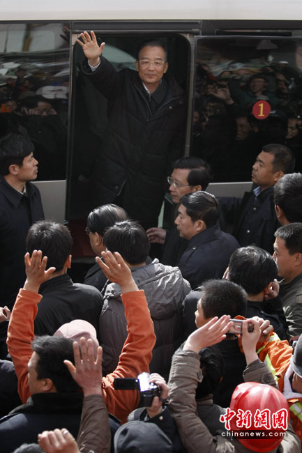 2010年4月16日,中国国务院总理温家宝在青海省玉树藏族自治州玉树县地震灾区视察救援现场。4月14日07时49分许,青海省玉树藏族自治州玉树县(北纬33.1,东经96.7)发生7.1级地震。中新社发 盛佳鹏 摄