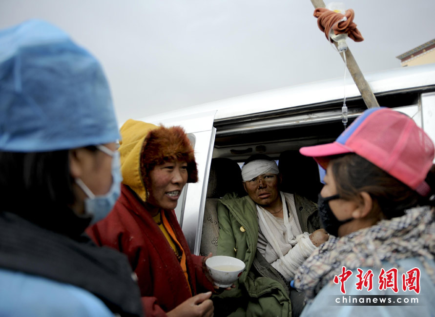 4月16日,一名地震中受伤者在青海玉树体育场的车里接受治疗。 中新社发 廖攀 摄