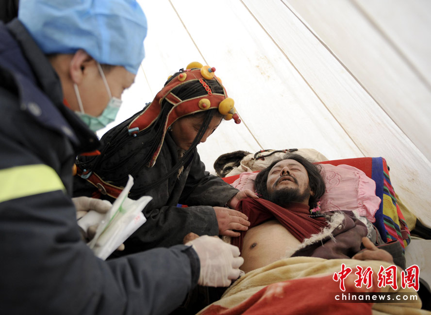 4月16日,青海玉树体育场地震灾民安置点,武警医院医疗队医务人员来到东周丹增家的帐篷里为伤者检查身体。中新社发 廖攀 摄