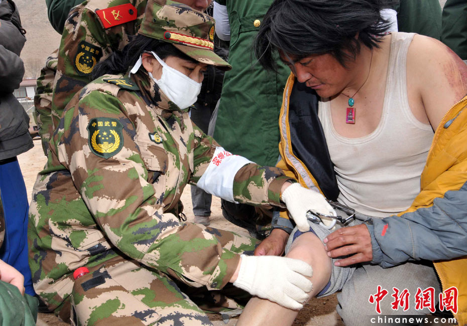 4月16日上午,广东边防总队抗震救灾医疗队在青海玉树州结古镇民族师范学院广场设立救治点,当日救助地震灾区伤员200多名。中新社发 陈森阳 摄