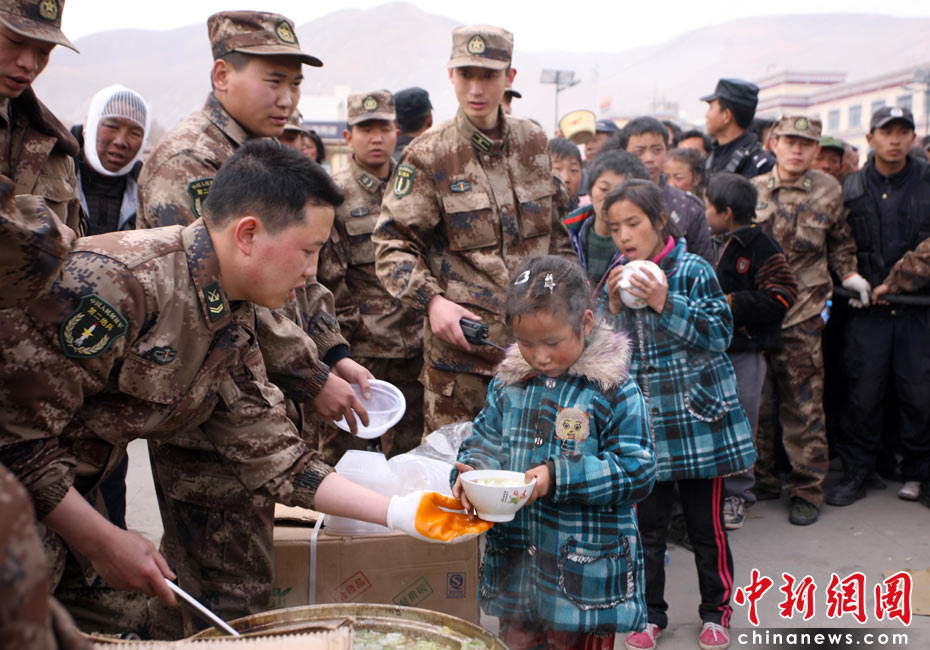 4月16日,青海省玉树藏族自治州玉树县地震发生第三天,为确保灾民有饭吃、有帐篷住,玉树城内各个安置点架起锅灶为受灾民众分发免费食物并帮助搭建帐篷。4月14日07时49分许,青海省玉树藏族自治州玉树县(北纬33.1,东经96.7)发生7.1级地震。中新社发 刘忠俊 摄