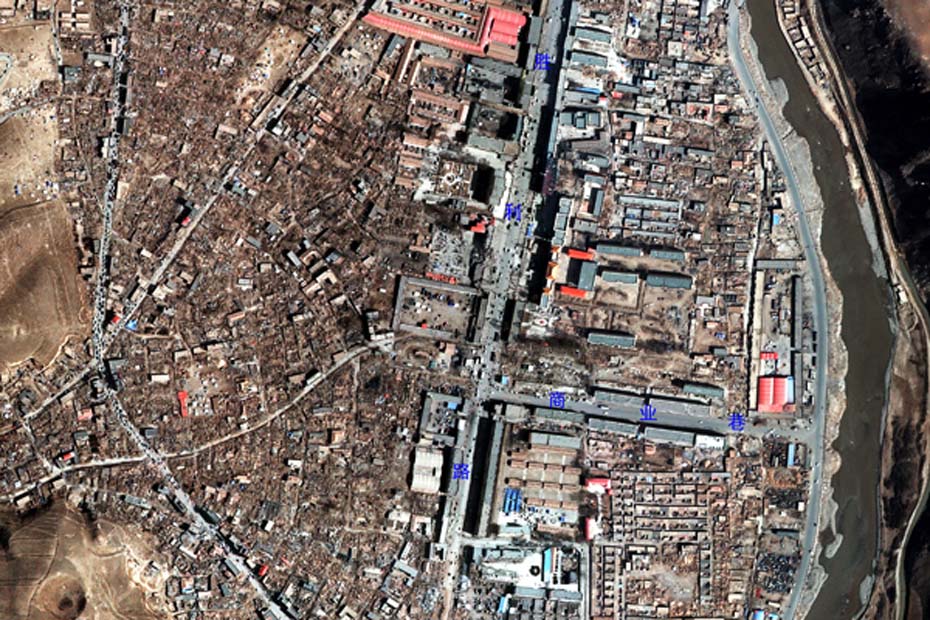 利用对地观测中心2010年4月16日获取的高分辨率航空遥感数据,提取出玉树州结古镇城区范围内地震破坏最严重或典型地区,使之与GoogleEarth中相应位置的震前遥感卫星数据进行对比,直观展现结古镇在此次地震中的受影响程度。图片来源:中国科学院