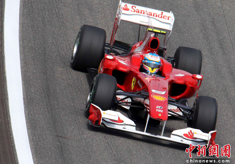 4月17日下午,2010国际汽联F1世界锦标赛上海站在上海国际赛车场举行排位赛,代表红牛车队出战的德国车手维特尔获得杆位,队友、澳大利亚车手韦伯获得第二名,法拉利车队的西班牙车手阿隆索获得第三名。中新社记者 任晨鸣 摄
