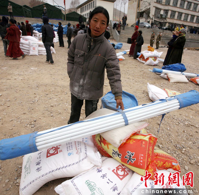 4月17日,大批救灾物资抵达青海省玉树地震灾区,当地政府及时组织将救灾帐篷和粮食分发到灾民手中。图为玉树清水河乡的受灾民众领到全家的救灾物资粮食和帐篷。中新社发 刘忠俊 摄