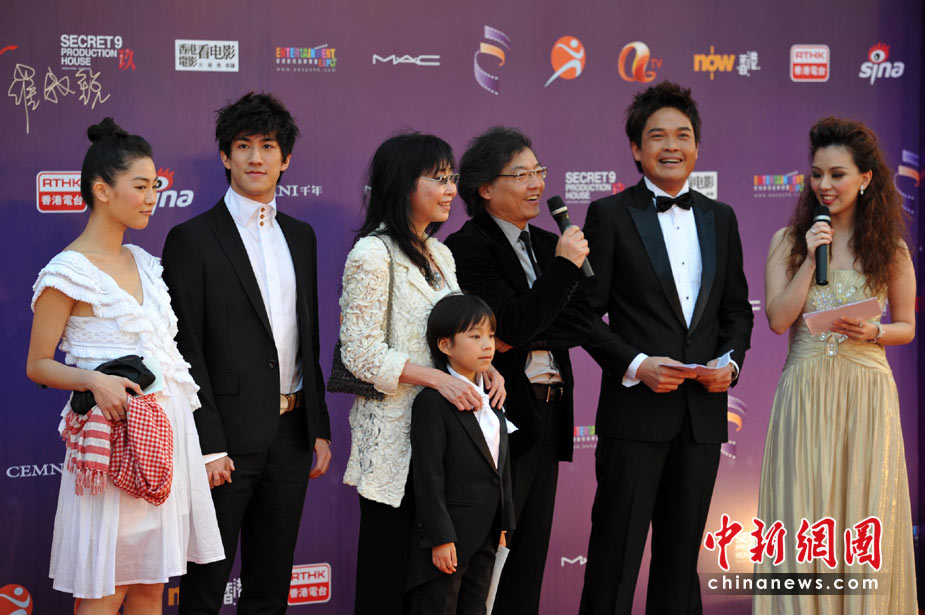 4月18日,参加第29届香港电影金像奖颁奖典礼的舒淇、何超仪、林熙蕾、杨千女华、梁咏琪、刘家良、张家辉、张震、曾志伟、钱嘉乐、关锦鹏、余文乐、吴彦祖、冯德伦、阮经天、赵又廷、许志安、黄子华等明星,在粉丝的欢呼声中、在媒体记者追逐中,正踏上红地毯步入香港文化中心大剧院。城中盛事“金像奖颁奖典礼”在这举行。图为《岁月神偷》导演与主要角色。中新社发 郑祚声 摄