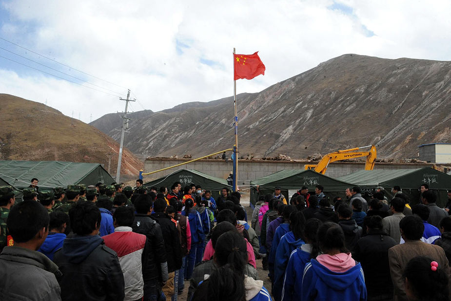 4月18日,70多名孩子在地震四天后重新走进了课堂,玉树州孤儿学校成为了地震灾区第一所复课的学校,刚完成帐篷搭建的青海省玉树藏族自治州第一民族中学3个年级的学生也开始复课。图为4月18日,青海省玉树藏族自治州第一民族中学师生举行复课仪式。图片来源:新华网