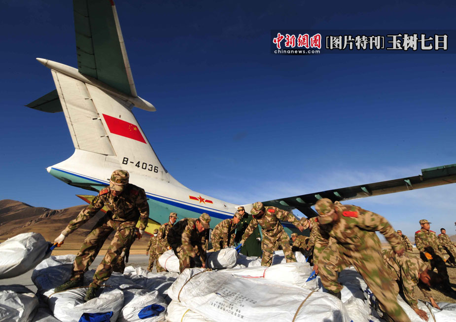 4月17日凌晨6点开始,空军紧急出动飞机8架,飞行8架次,截止到中午12点,共运送帐篷1080顶,救灾器材20吨,野战食品24吨,共计158吨。据玉树气象台预报,灾区当日下午到夜间有阵雨,19日白天至夜间有小到中雪,气温将降到零度以下。中新社发 沈玲 摄