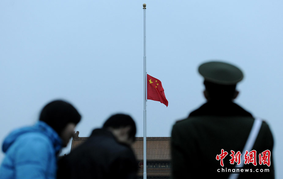 4月21日,北京天安门广场升国旗仪式结束后,下半旗向玉树地震遇难同胞致哀。为表达全国各族人民对青海玉树地震遇难同胞的深切哀悼,中国国务院决定,举行全国哀悼活动,全国和驻外使领馆下半旗致哀,停止公共娱乐活动。中新社发 刘震 摄