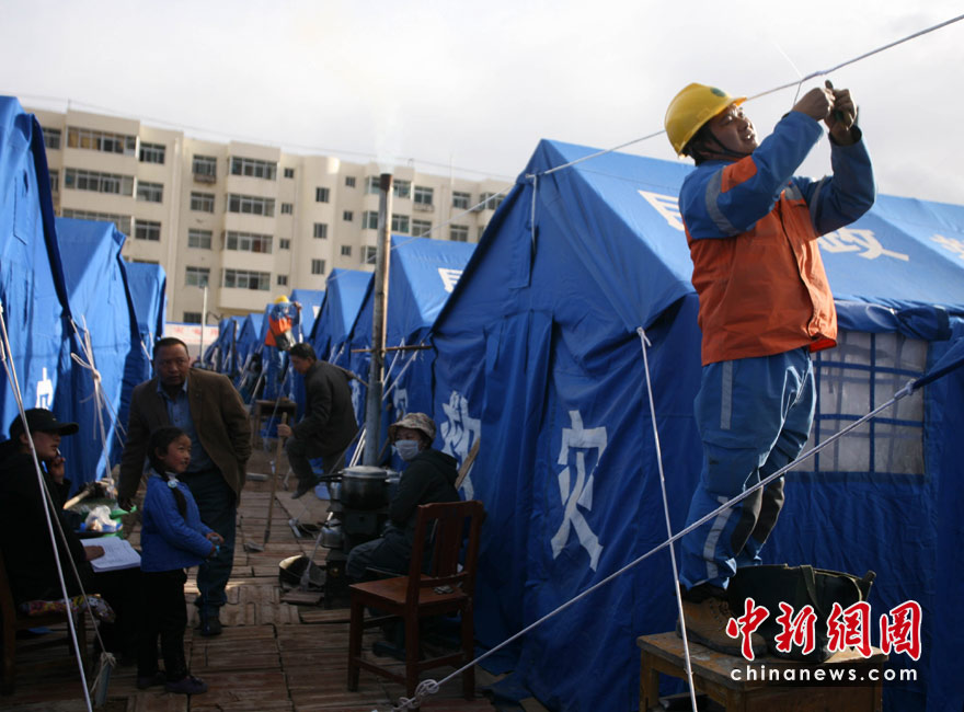 4月20日,国家电网四川公司抗震救灾突击队经过辛苦工作,青海玉树红旗小学正式恢复供电。这是玉树第一所恢复供电的学校。图为来自四川的电力技术人员正在为40顶帐篷牵线接灯。中新社发 刘忠俊 摄