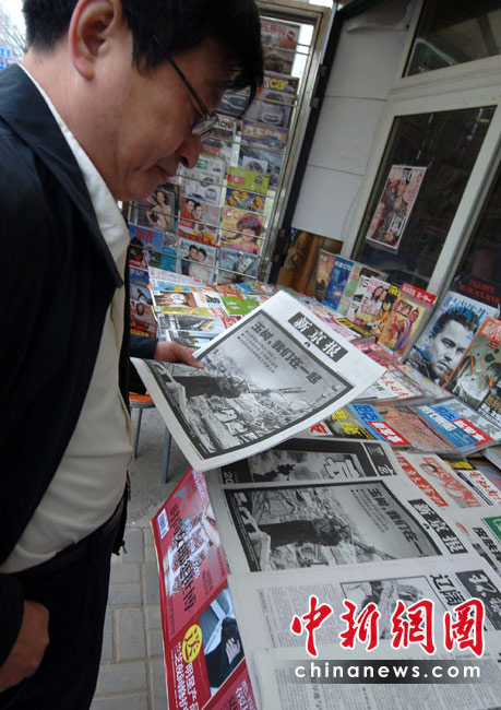 4月21日,按照中国国务院决定,举行全国哀悼活动,全国和驻外使领馆下半旗志哀,停止公共娱乐活动。当日北京各家报社刊出悼念玉树地震遇难同胞特刊,并撤销了一切彩色图片和字头,采用黑白版面。中新社发 邹宪 摄