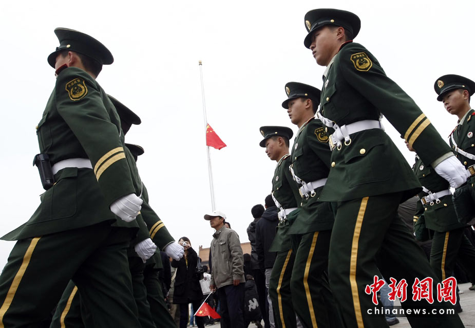 4月21日,为表达全国各族人民对青海玉树地震遇难同胞的深切哀悼,中国国务院决定,举行全国哀悼活动,全国和驻外使领馆下半旗志哀,停止公共娱乐活动。中新社发 杜洋 摄