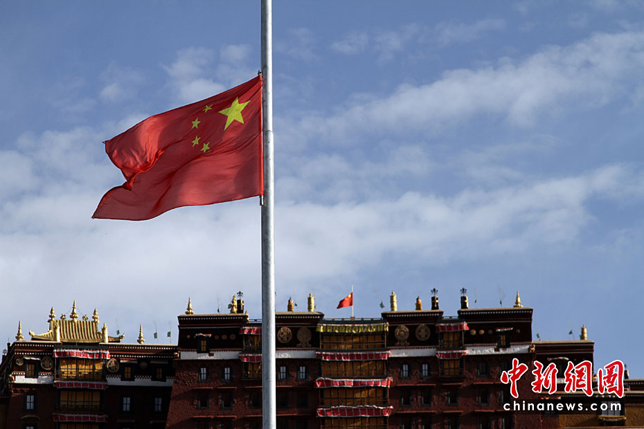 4月21日,西藏布达拉宫广场上举行降半旗仪式。同时,布达拉宫红宫顶端的红旗也降半旗,向青海玉树地震遇难者志哀。中新社发 徐长安 摄