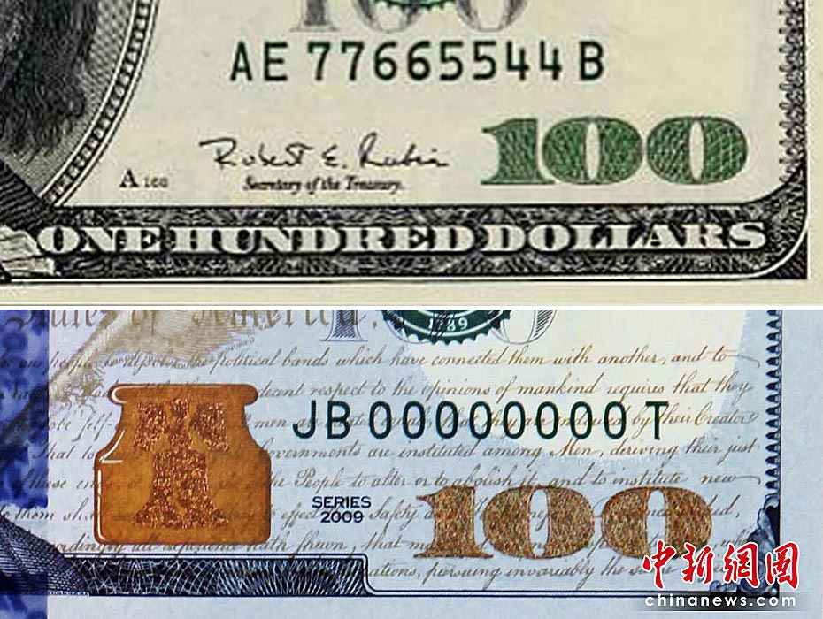 4月21日,美国财政部和美联储共同发布新版100美元面值的纸币票样。此次发行新版百元美钞旨在防范假钞,同时,老版美元仍将继续流通。图片来源:中国新闻网