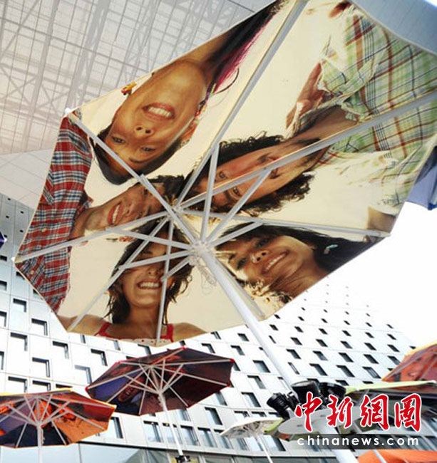 2010年4月22日,上海世博会主题馆门前的观众等候区,竖立着一把把遮阳的花伞,每一把花伞上都印着四方友人的灿烂微笑。世博园区为了应对大量客流,园区设置了大量遮阳和避雨设施,遮阳避雨面积总量达40万平方米。杨毅 摄