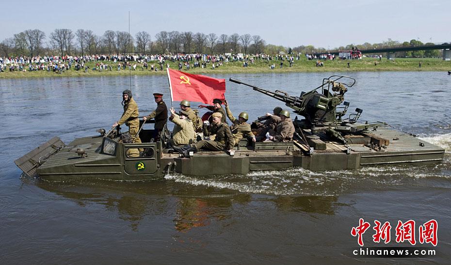 德国当地时间4月24日,演员身着二战时期美苏军装在德国托尔高南部易北河畔的一座小桥上重现当年的“会师”一幕。