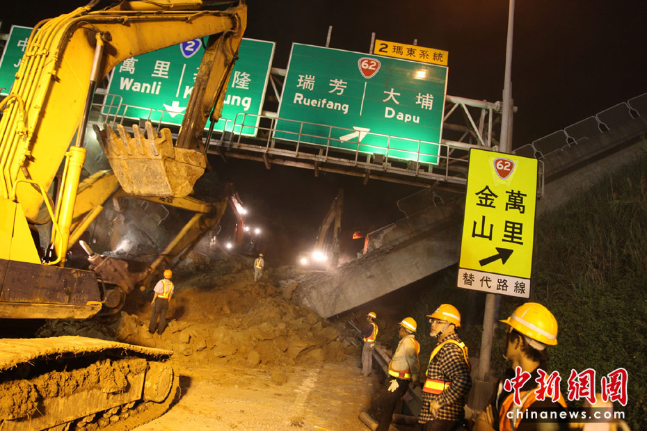 4月25日, 台湾一条交通要道、“北二高”基隆段发生山崩意外,倾泻而下的土石压垮一座高架桥,并覆盖道路约200米,据传有人车被埋。图为工程人员连夜开挖,展开大搜救。 中新社发 董会峰 摄