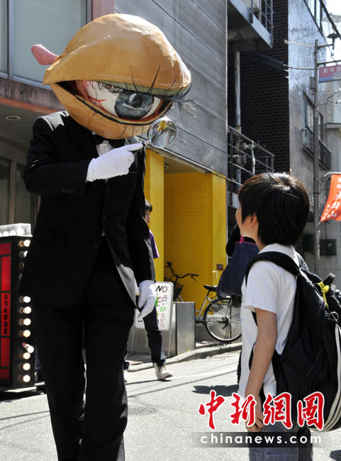 4月26日,日本一个表演艺术团体扮成“独眼怪人”在街头亮相,大玩行为艺术。