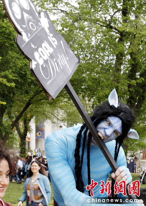 2010年4月25日,在美国首都华盛顿,两名扮成电影《阿凡达》里纳美人模样的演员参加“气候集会”演唱会。当天,华盛顿举行演唱会,纪念“世界地球日”。4月22日是第41个“世界地球日”。