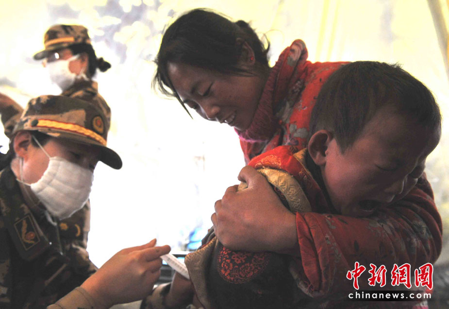 武警青海总队玉树支队是最先投入抗震救灾的先锋部队,地震发生时恰逢部队出操,营房严重受损而官兵平安无恙。这里立即成为抗震救灾的军民和媒体的大本营之一,医疗救护队和新型炊事车昼夜为军民服务。集结在地震灾区的各路部队从4月低之前全面转入安置群众和灾后重建,这里的的后勤已经得到基本保障。 图为医疗队军医为受灾民众治疗。 中新社记者 贾国荣 摄