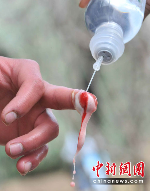 武警青海总队玉树支队是最先投入抗震救灾的先锋部队,地震发生时恰逢部队出操,营房严重受损而官兵平安无恙。这里立即成为抗震救灾的军民和媒体的大本营之一,医疗救护队和新型炊事车昼夜为军民服务。集结在地震灾区的各路部队从4月低之前全面转入安置群众和灾后重建,这里的的后勤已经得到基本保障。 图为官兵手部受伤,用药品冲洗。 中新社记者 贾国荣 摄