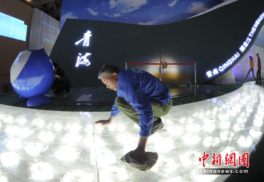 4月27日,中国省区市联合馆中的青海馆,工作人员维护设施,展览工作准备就绪。中新社发 廖攀 摄