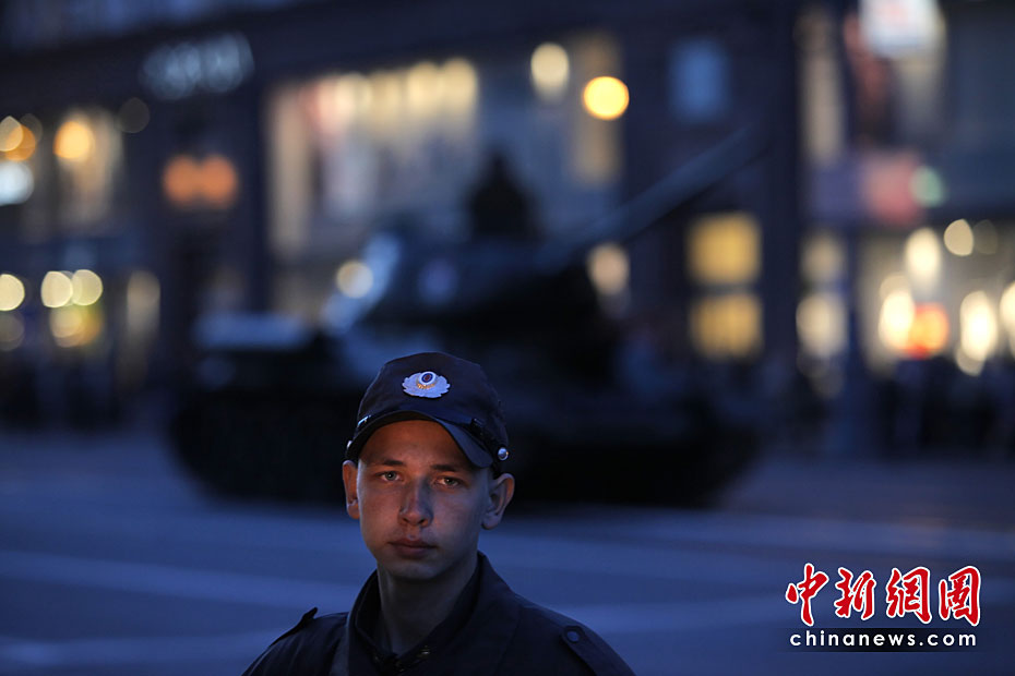 此次红场阅兵包括两部分内容:历史部分和现代部分。历史部分由身穿卫国战争时期军服的士兵在鹅卵石道上进行,同时还会有9辆T-34坦克和8辆SU-100自行火炮。现代部分由13辆老虎装甲车、BTR-80装甲车、BMP-3步兵战车、T-90A坦克和S-400防空系统等。图片来源:中国新闻网