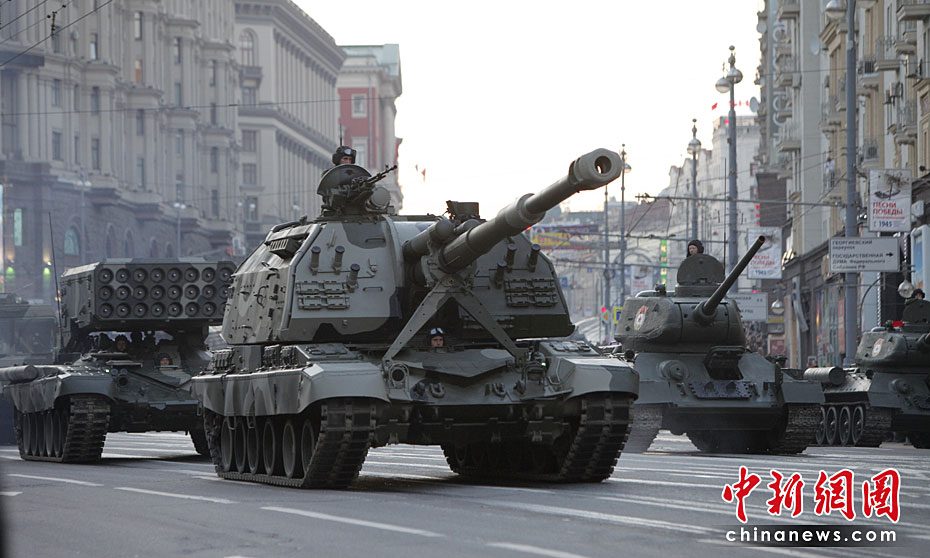 此次红场阅兵包括两部分内容:历史部分和现代部分。历史部分由身穿卫国战争时期军服的士兵在鹅卵石道上进行,同时还会有9辆T-34坦克和8辆SU-100自行火炮。现代部分由13辆老虎装甲车、BTR-80装甲车、BMP-3步兵战车、T-90A坦克和S-400防空系统等。图片来源:中国新闻网