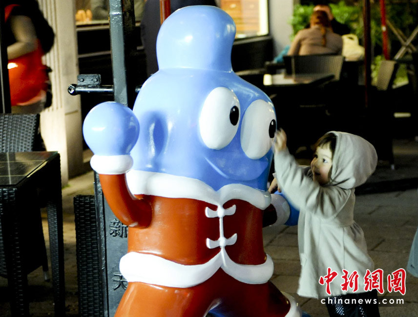 4月26日,一名外国小女孩在上海新天地的食肆内玩味世博会吉祥物海宝。世博会开幕在即,面临“大考”的上海充满喜庆气氛。 中新社发 廖攀 摄
